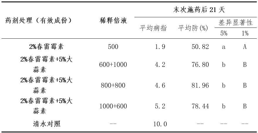 實驗結果通過Duncan’s新復極差法進行方差分析表明,田間試驗反饋數據結果中,5%大蒜素微乳劑與2%春雷霉素組間防治效果差異不顯著,5%大蒜素微乳劑完全能夠達到化學藥劑2%春雷霉素相同的防治效果。而單劑與復配處理組間的防治效果差異達到顯著性水平。2%春雷霉素加5%大蒜素兩者復配后防效有顯著性提高,當兩者均稀釋800倍液后復配防治效果最為顯著。
