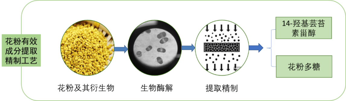 花粉多糖是以花粉為原料,分離得到水溶性花粉提取物。在提取過程中,引入了纖維素酶解破壁技術,并配合一定程度的機械攪拌,在較為溫和的條件下破除油菜花粉壁,能夠最大程度的釋放花粉中花粉多糖等有效成分,實現花粉資源的高效利用。